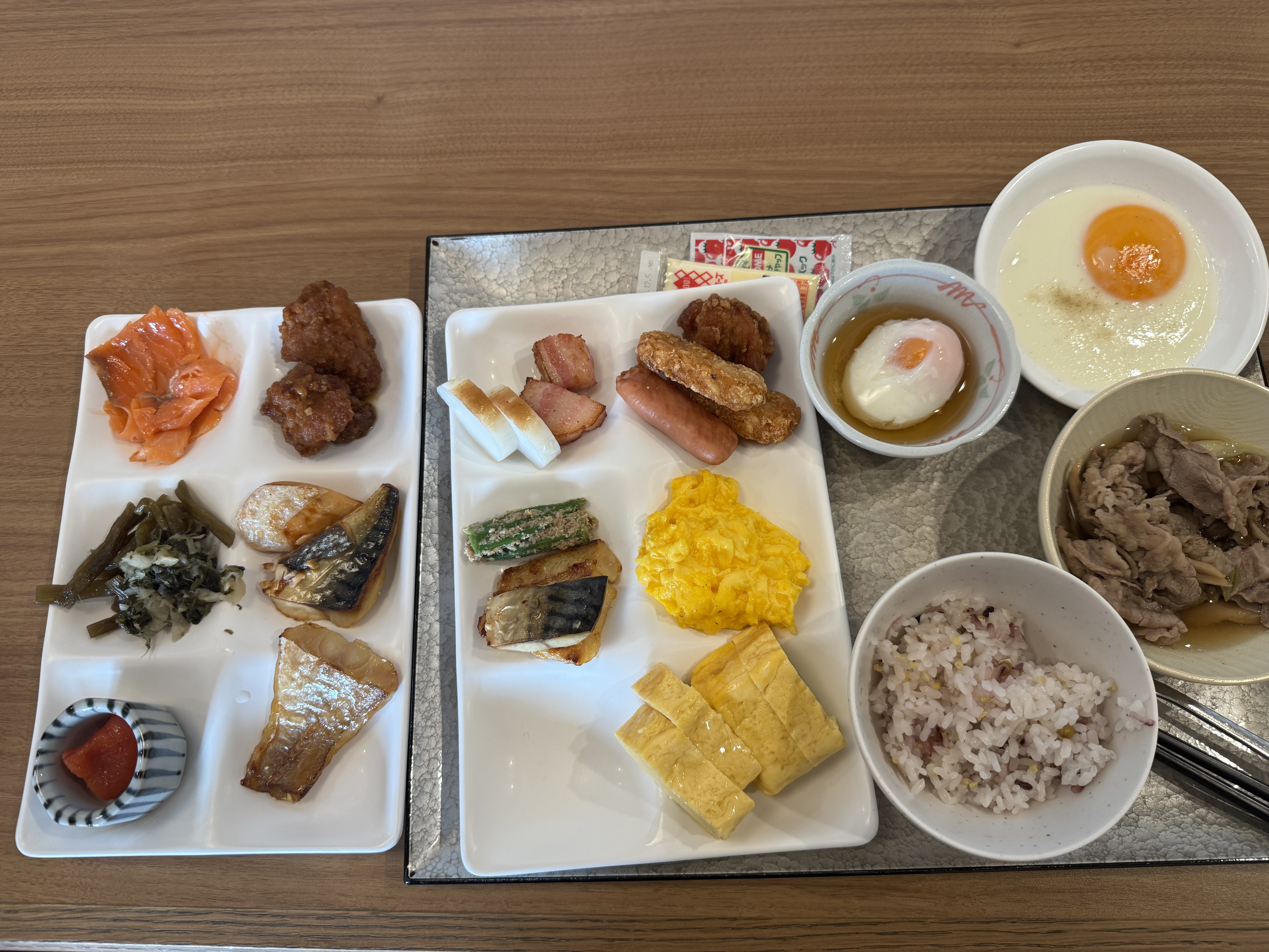 조식은 뷔페 형식으로, 일식+양식 골고루 있었고 기본 반찬, 생선구이, 샐러드, 과일, 음료 등 다양하게 나와서 골라먹는 재미 있었어.