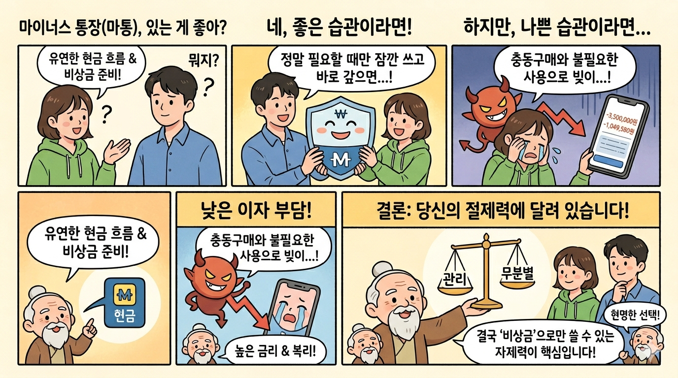 마이너스 통장(마통)은 양날의 검과 같아서, 본인의 금융 습관과 사용 목적에 따라 답이 달라집니다. "있는 게 좋다/나쁘다"라고 단정하기보다 각각의 장단점을 따져보고 결정하시는 게 좋아요.