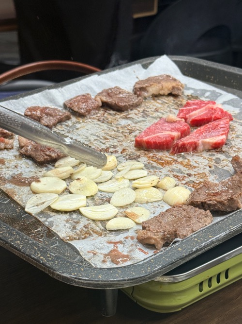 • 등심: 신선한 고기 질감에 기름기도 적당히 있어 구워 먹기에 딱 좋았습니다. 불판에 마늘까지 함께 올려 구워 먹으니 고소함이 배가되더군요.