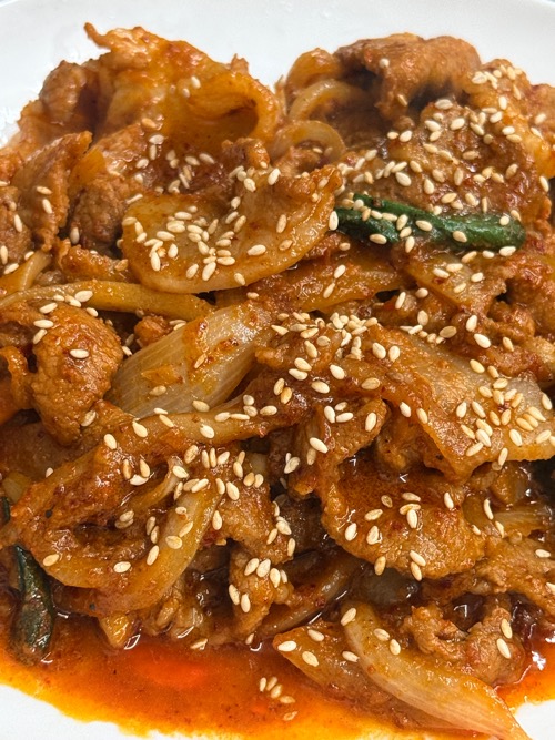 • 제육볶음: 매콤달콤한 양념에 볶아진 제육이 정말 밥도둑이었습니다. 위에 솔솔 뿌려진 깨가 고소함을 더해줘서 젓가락이 멈추질 않았습니다.