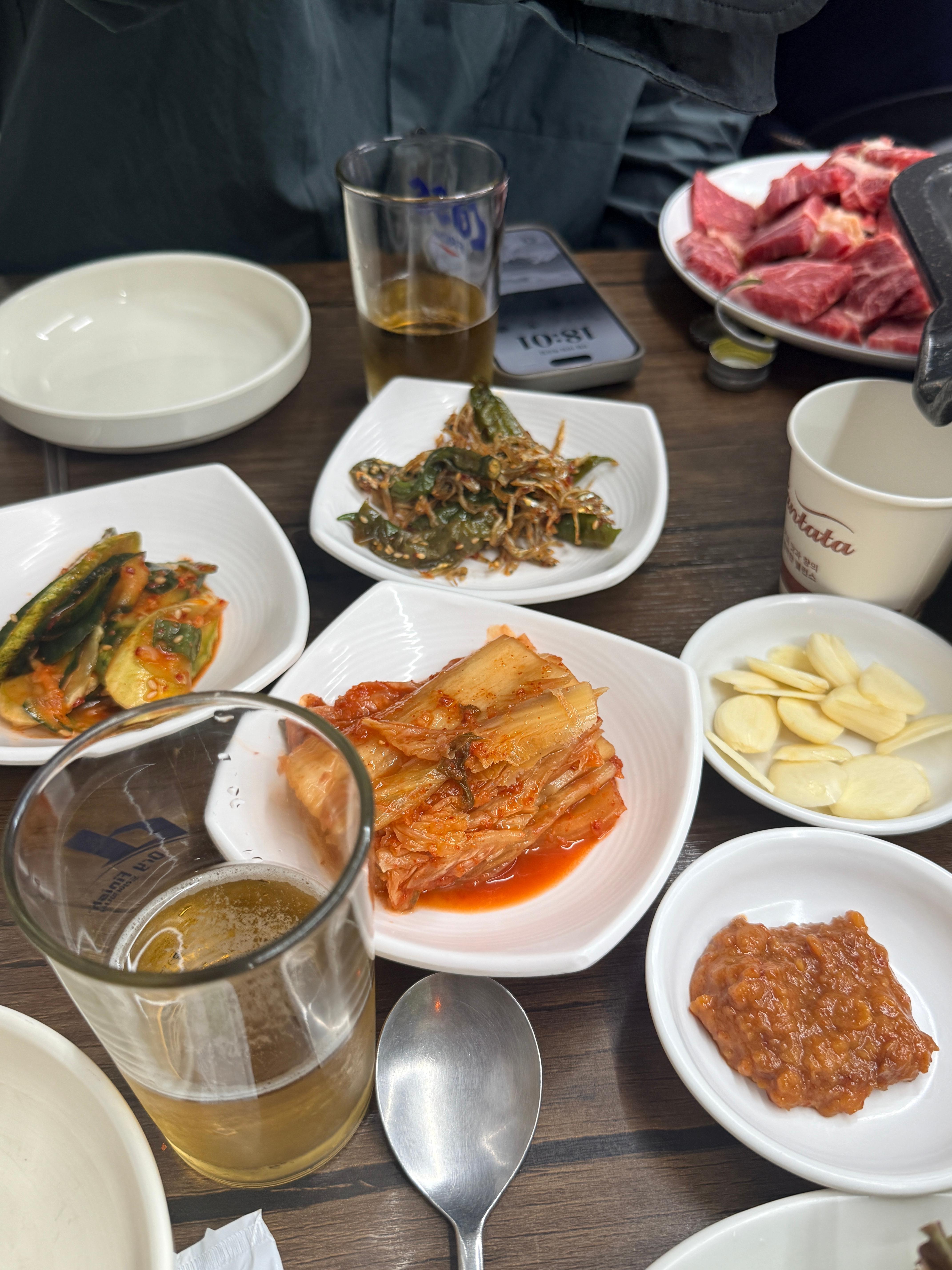 김치, 쌈장, 마늘, 각종 반찬들이 고기와 찰떡궁합이었고, 시원한 맥주까지 곁들이니 정말 완벽했어요.