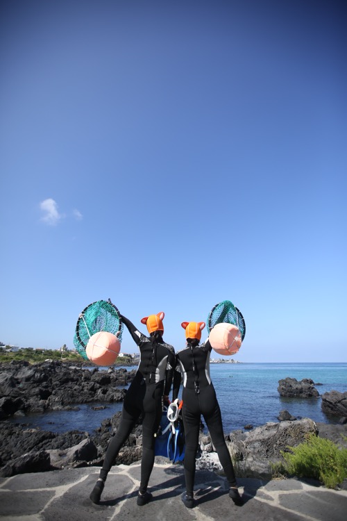 해녀복(드라이슈트)으로 갈아입고, 테왁(바다 위에 띄우는 둥근 부표)을 들고 바다로 출발