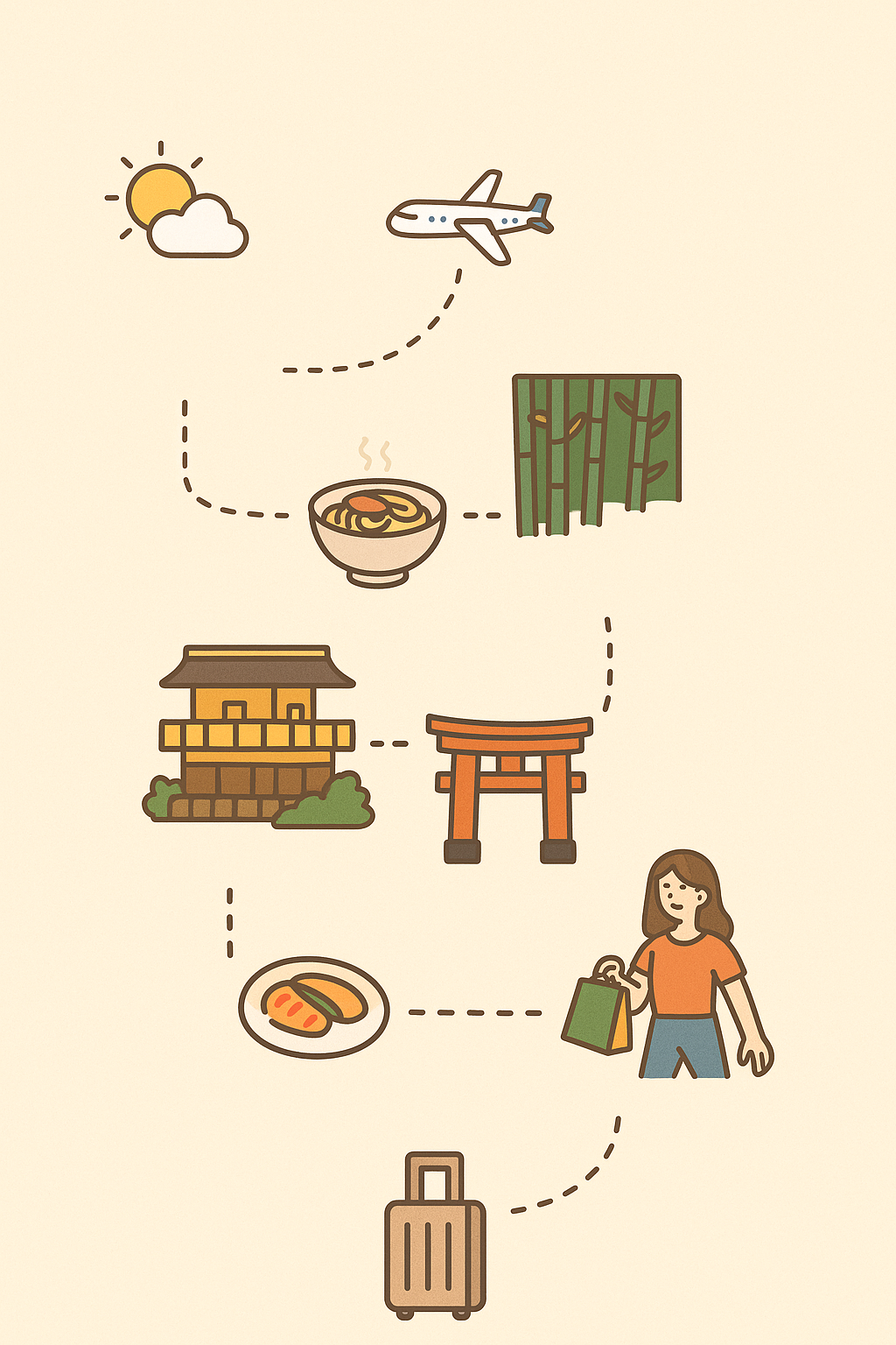 - 오전: 간사이 공항 도착 → JR 또는 공항버스 → 교토역